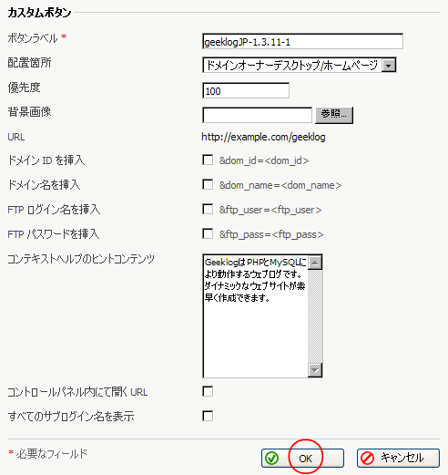 はい:PleskコントロールパネルにGeeklogへのアクセスボタンを設置します。
