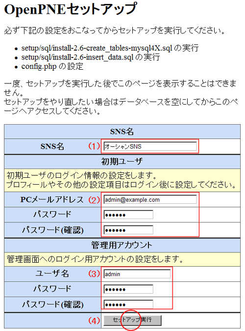 この様な画面が表示されたらOpenPNEの管理者情報を設定します。